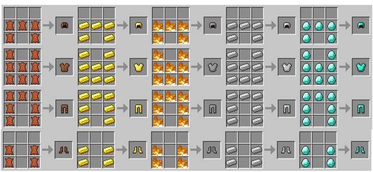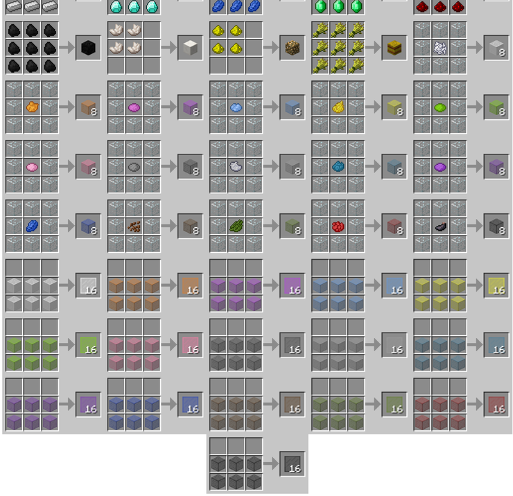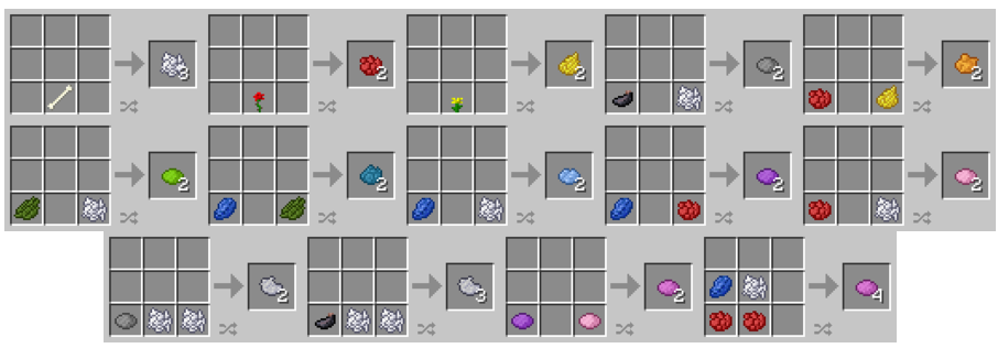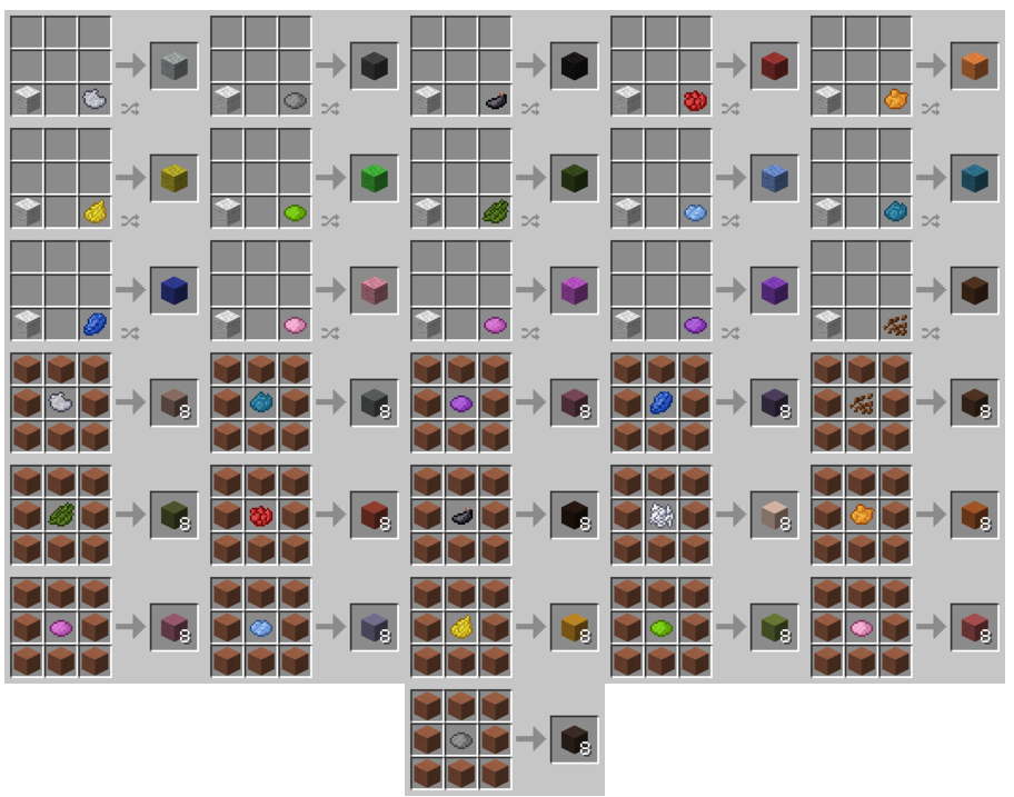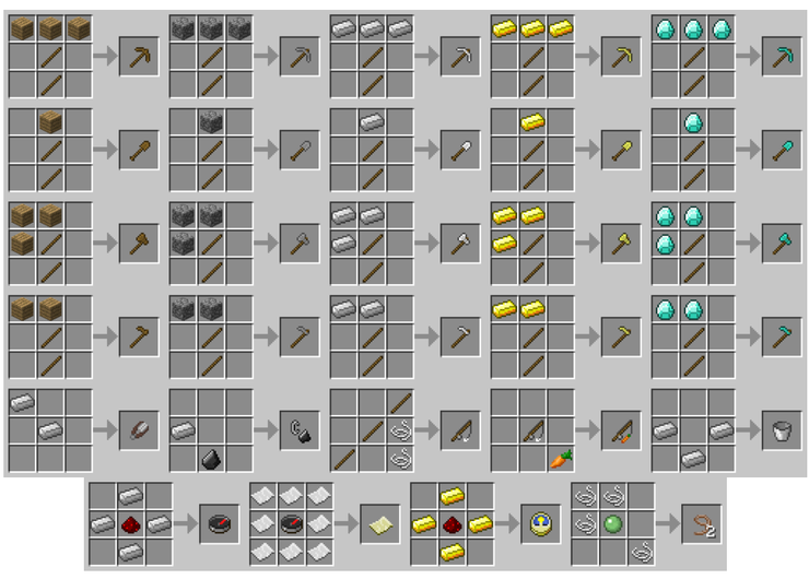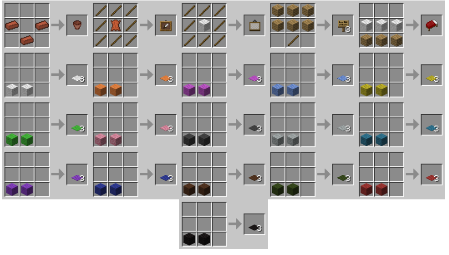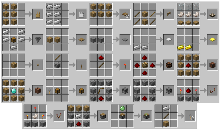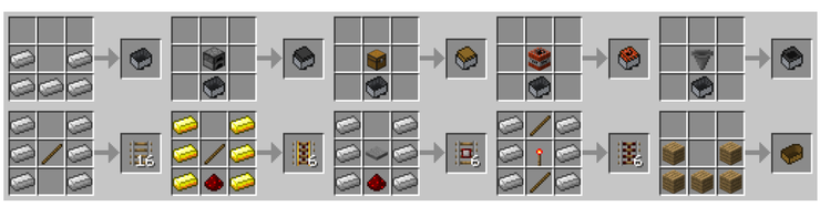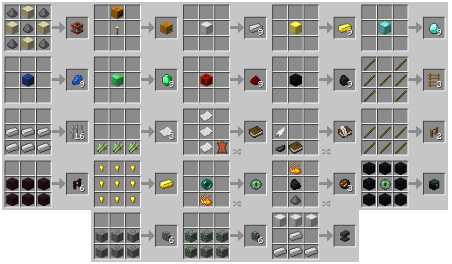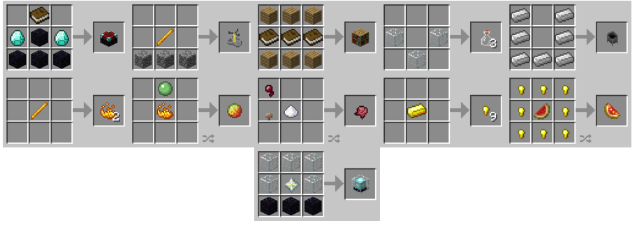 (TNT, 잭오랜턴, 주괴, 사다리, 철창, 종이, 책, 책과 깃펜, 울타리, 엔더의 눈, 화염구, 엔더상자, 담장, 모루)