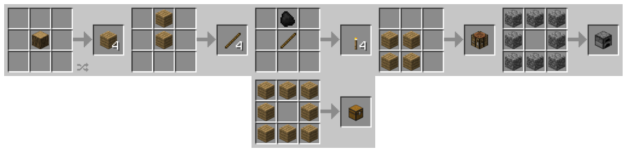 (목재, 막대기, 횃불, 워크벤치, 화로, 상자)